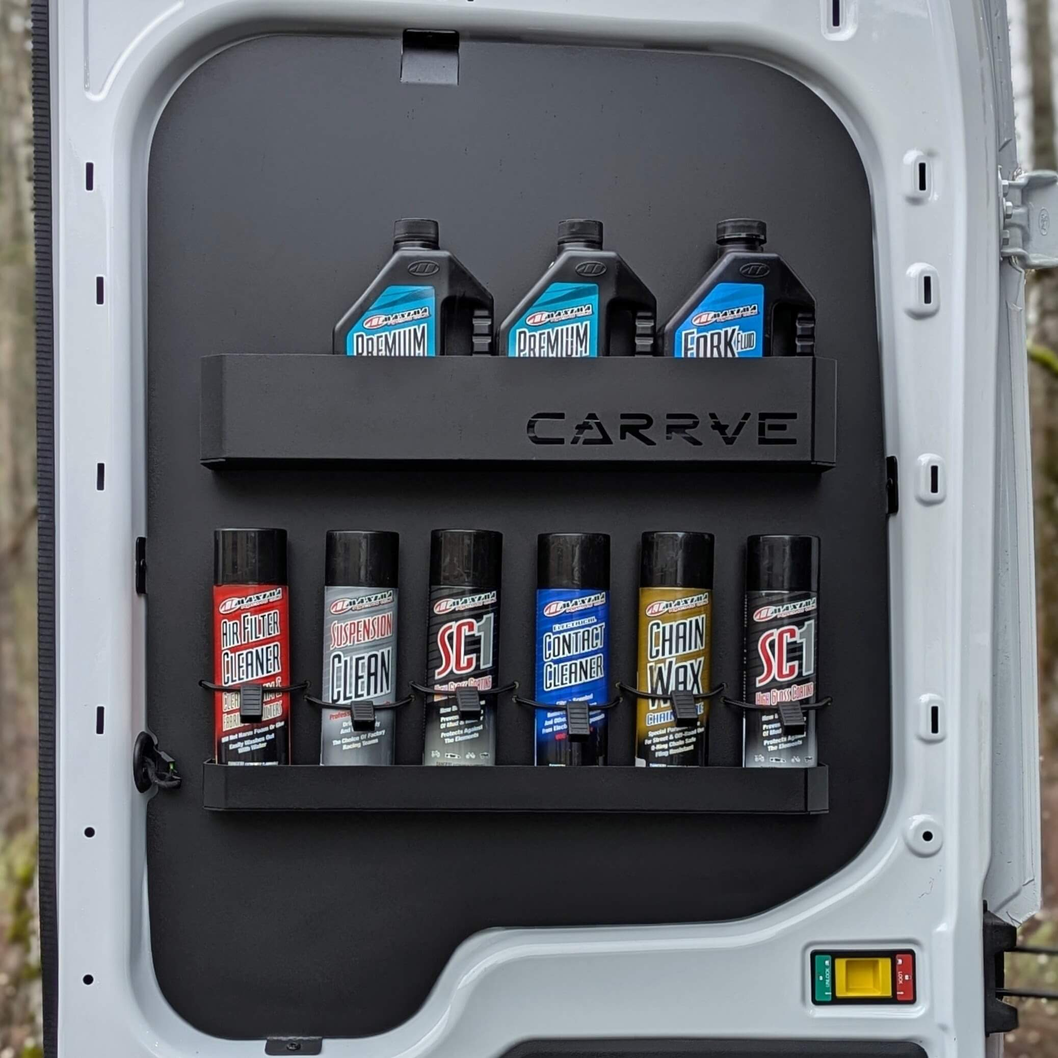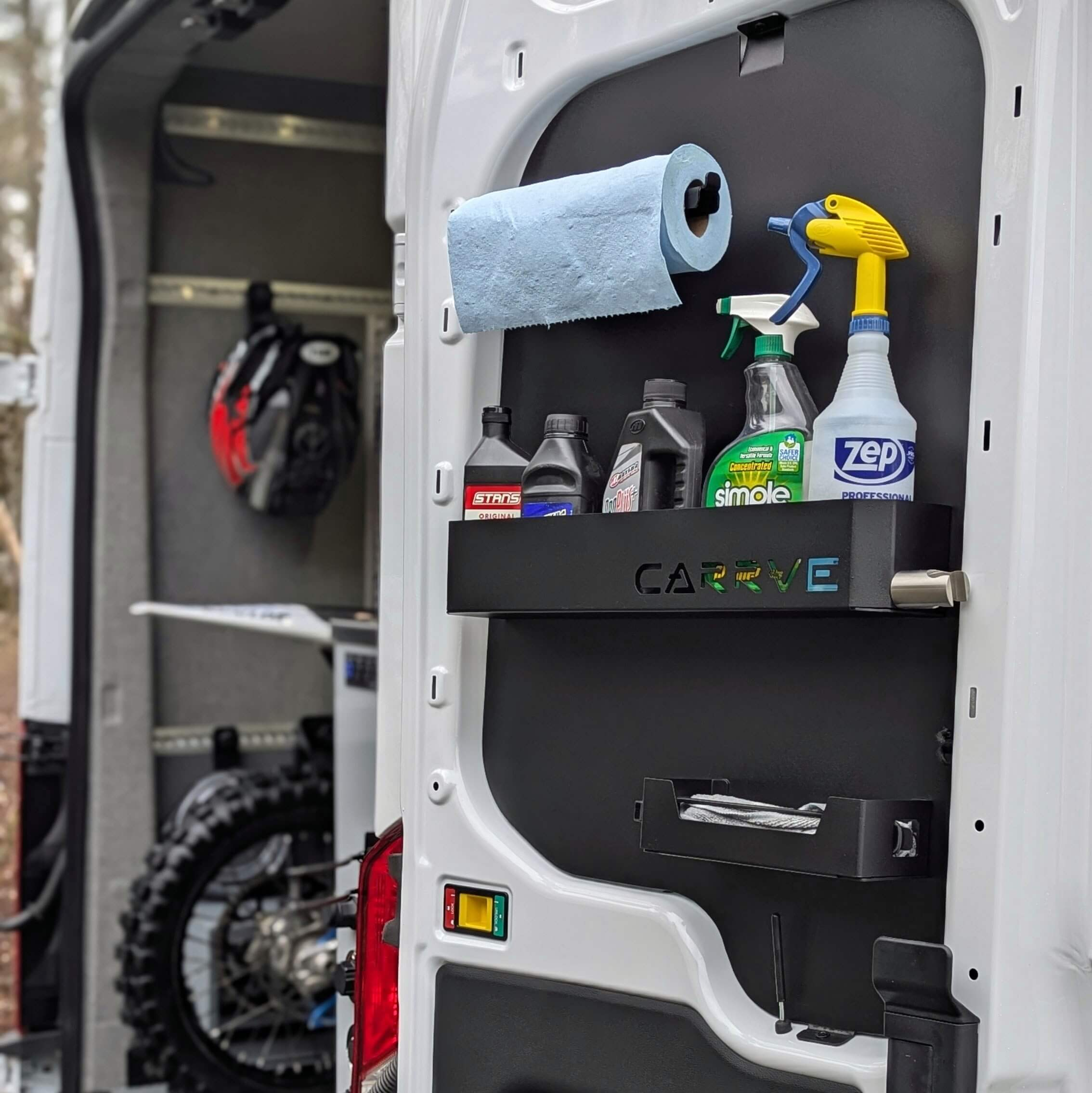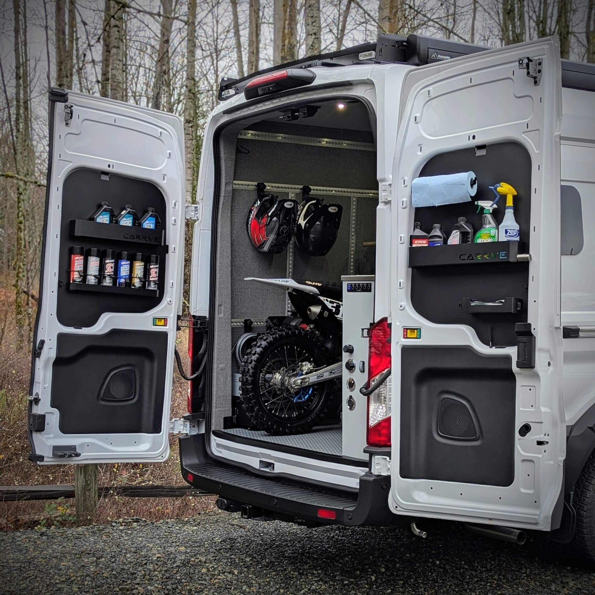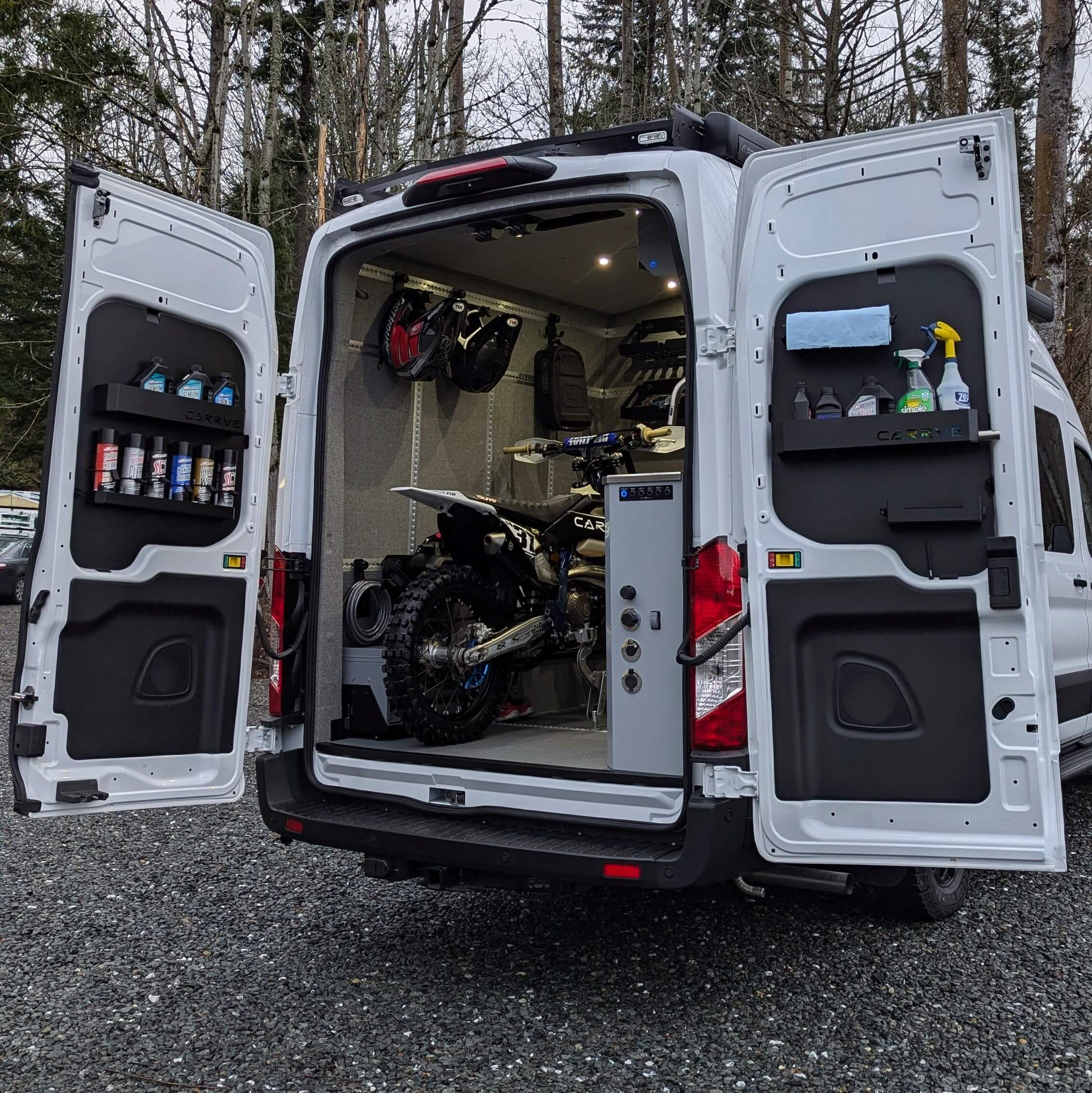 Built with dirt bikers and mountain bikers in mind, they provide secure storage for essentials like lubricants, oils, rubber gloves, paper towels, and cleaners. Easily accessible from both inside and outside the van, the two center cavity door panels streamline your setup, giving you quick access to essentials you need while working on your bike. Crafted from lightweight, durable aluminum with features to minimize rattling, these panels keep your gear secure and your van organized.